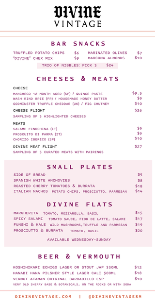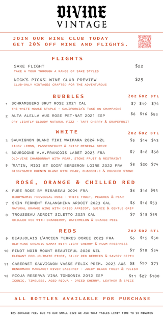 JOIN THE DIVINE WINE CLUB! 2 premium bottles every month, wine by the glass discounts & more. Click Here To Learn More.